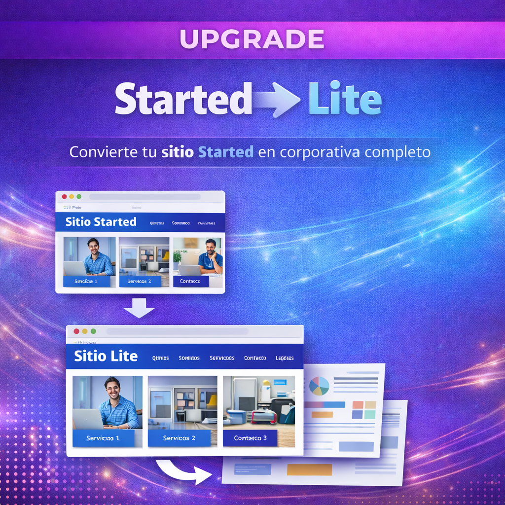 Eleva tu sitio Started a un Lite corporativo completo con 5 páginas profesionales, menú personalizado y capacidad expandida. Conserva toda tu inversión inicial y agrega estructura empresarial seria: 15 servicios, 8 imágenes, hasta 4 formularios personalizados y 2 correos corporativos. Ideal cuando tu negocio necesita presencia corporativa establecida y mayor credibilidad en el mercado.
