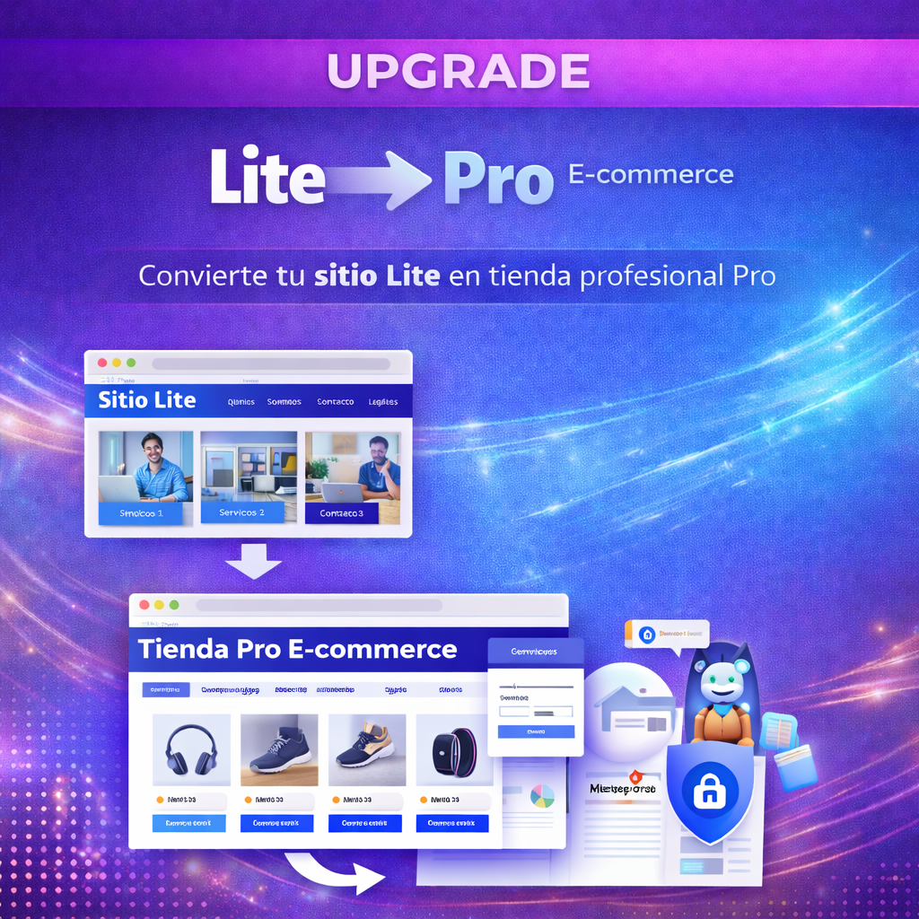 Transforma tu sitio Lite en una tienda online profesional Pro con capacidad de ventas completa. Conserva toda tu inversión inicial y agrega e-commerce funcional: hasta 30 productos, pasarela de pagos Mercado Pago, registro de clientes, live chat con IA, políticas completas y capacitación extendida para 2 usuarios. Ideal cuando estás listo para vender online de forma seria y profesional.